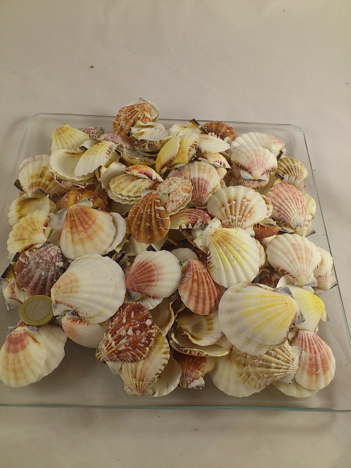 Pecten vexillum is ong. 4 cm groot. Indien gewenst kan je hierin makkelijk een gaatje boren.